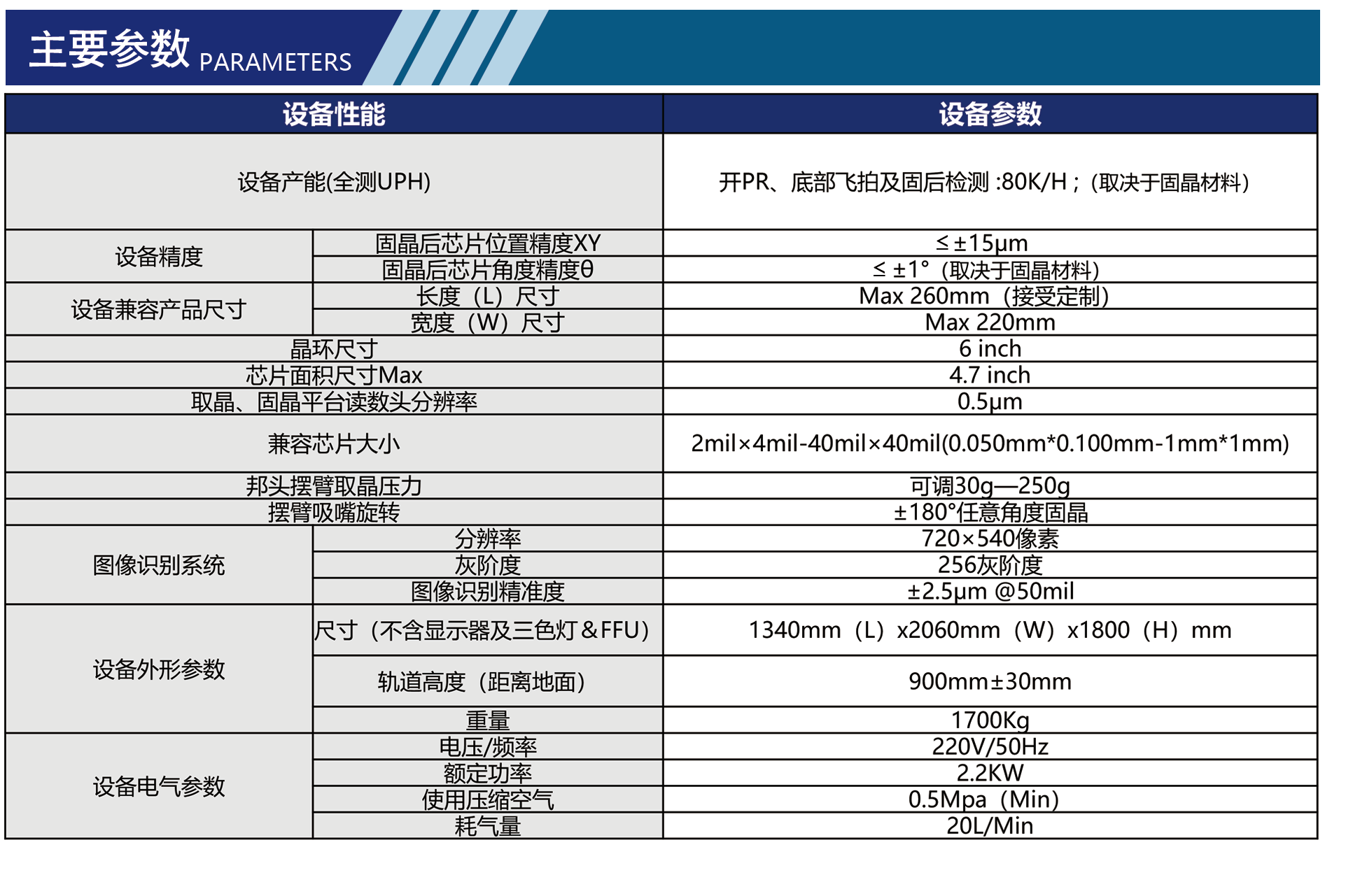 | 设备精度 | 固晶后芯片位置精度XY | ±15μm |
